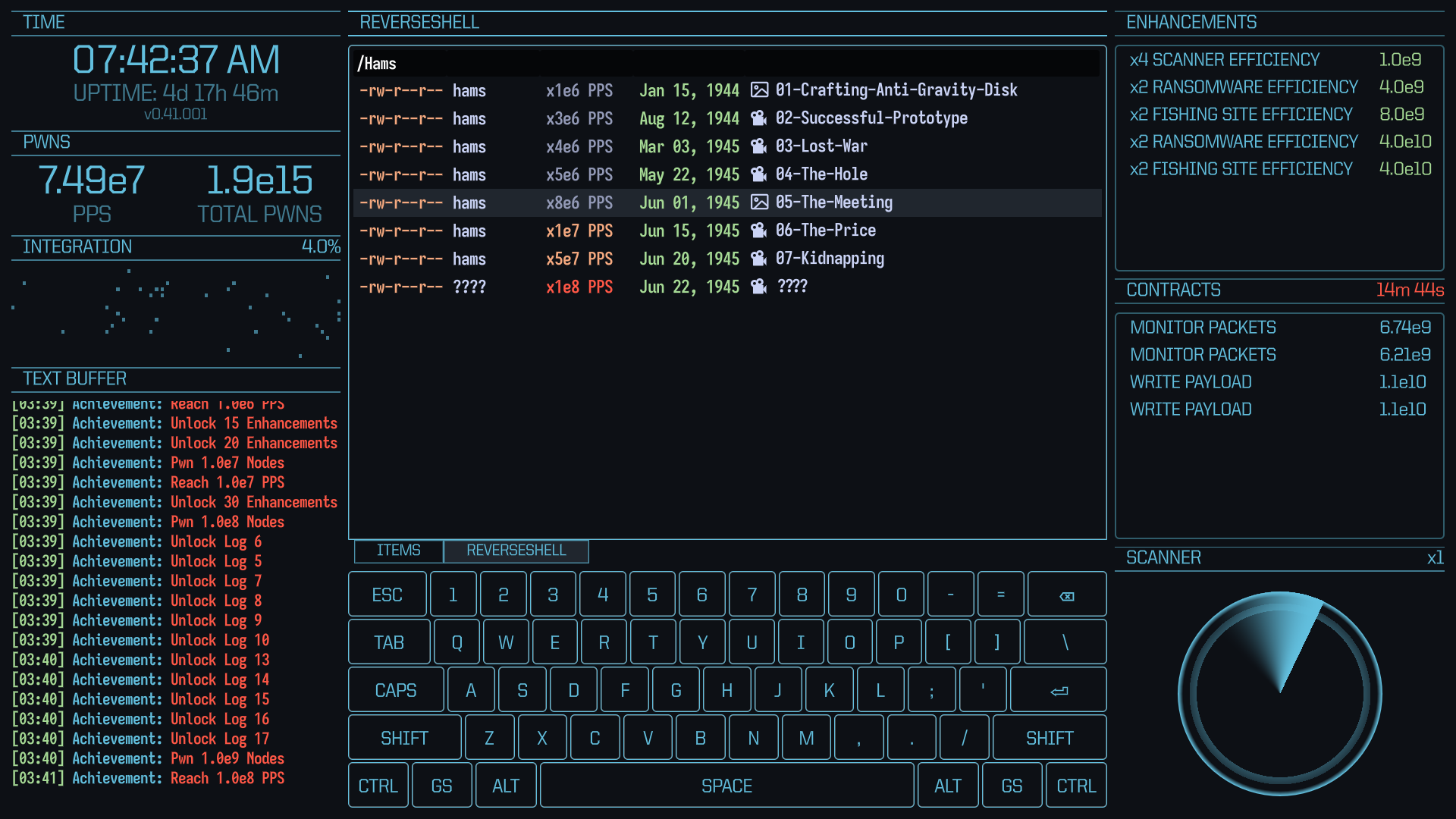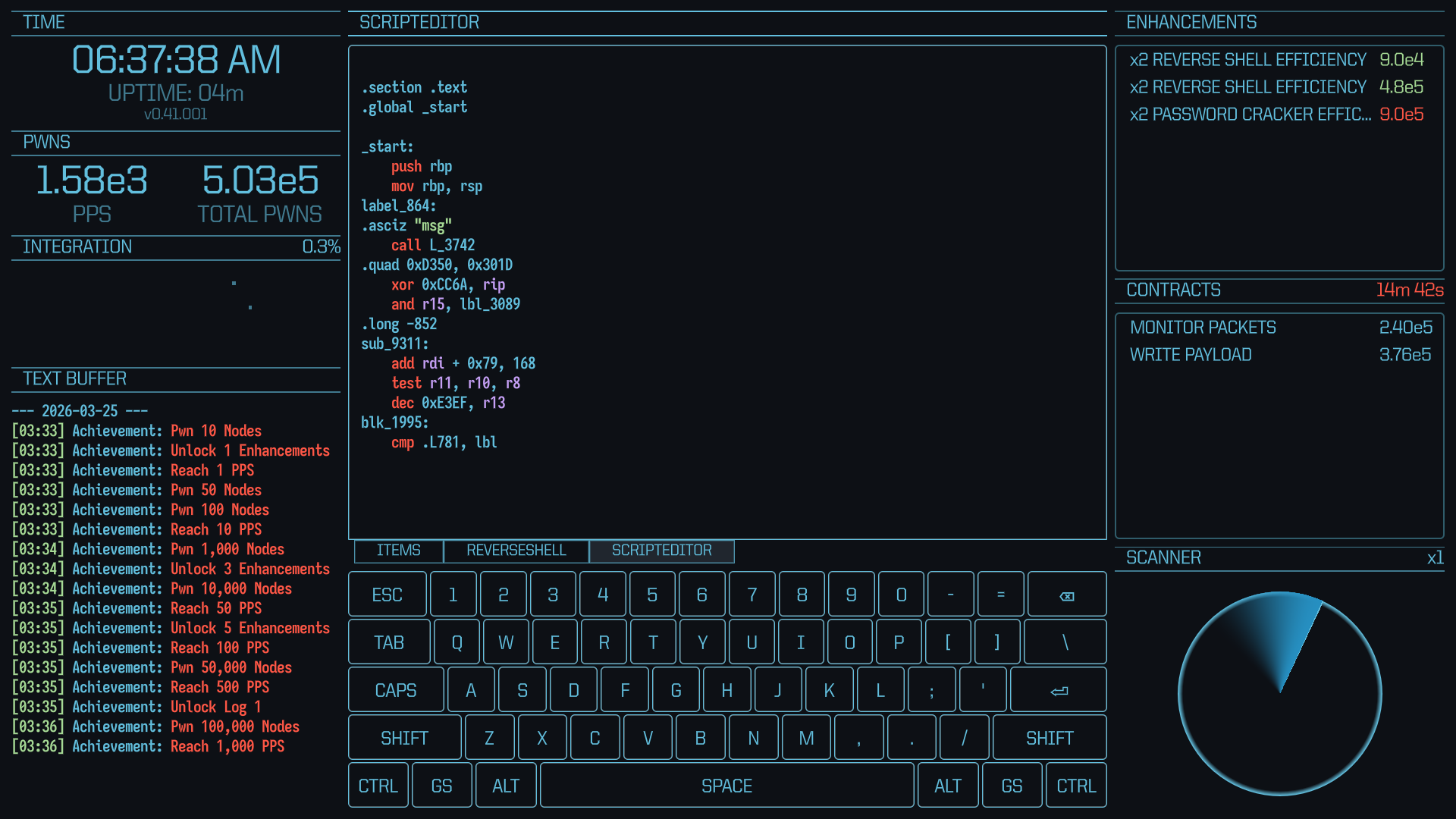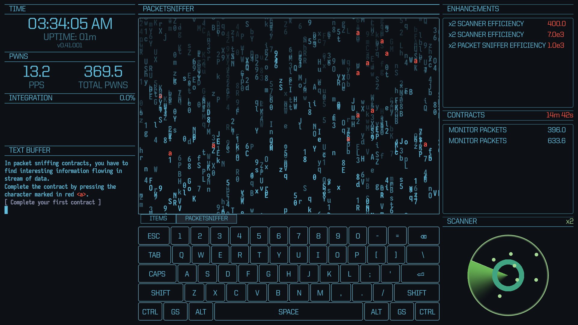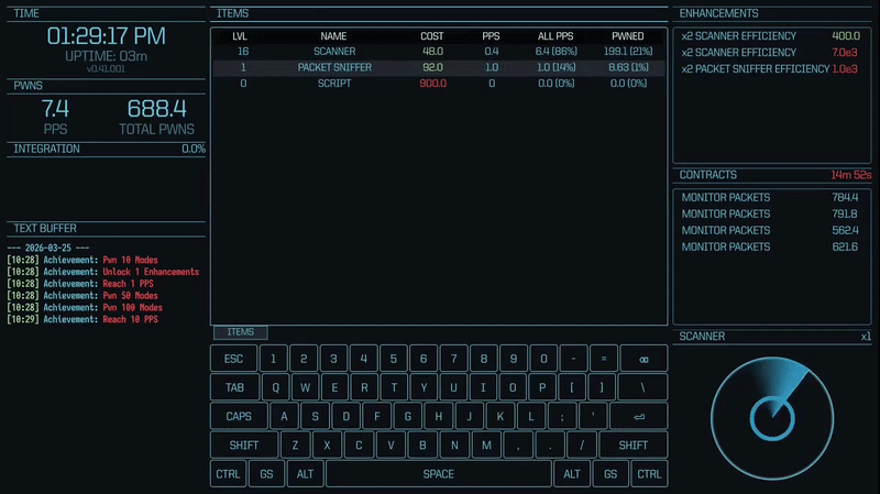 Deploy tools to complete contracts on the dark web and earn nodes in exchange. Each tool offers a unique contract minigame or upgrade to your workflow.